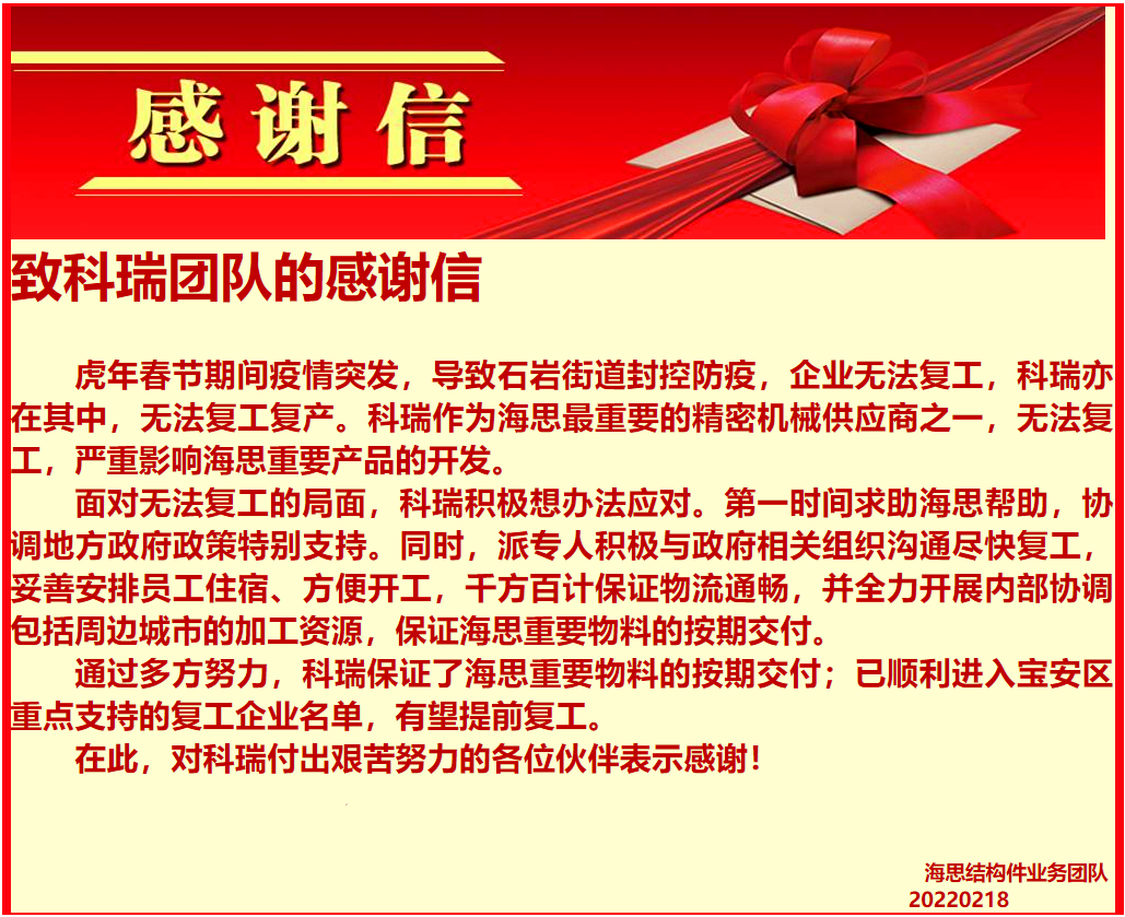 218日,公司技术精密加工事业部收到客户热情洋溢的感谢信,点名感谢团队5名成员。